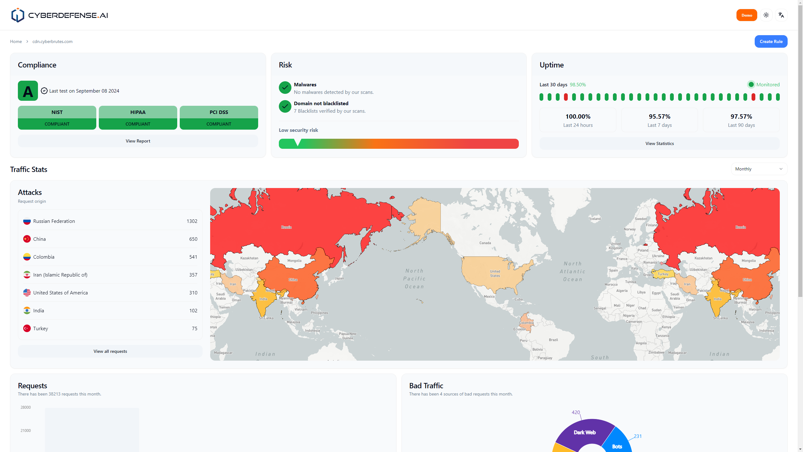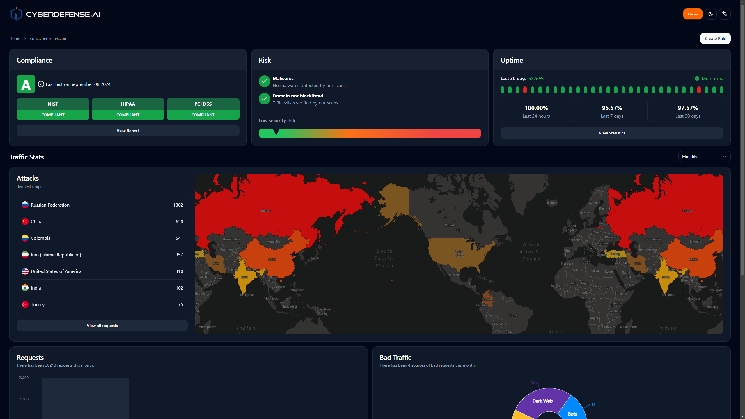 Incident Tracking with AI integration: CYBERDEFENSE.AI's Incident Tracking Solution harnesses AI to optimize uptime management. It intelligently integrates multiple features and technologies, allowing for traffic redirection based on server uptimes. This reduces the load on any single server and enables CYBERDEFENSE.AI to autonomously initiate alerts and deploy protective measures, maintaining application availability with minimal human intervention.
