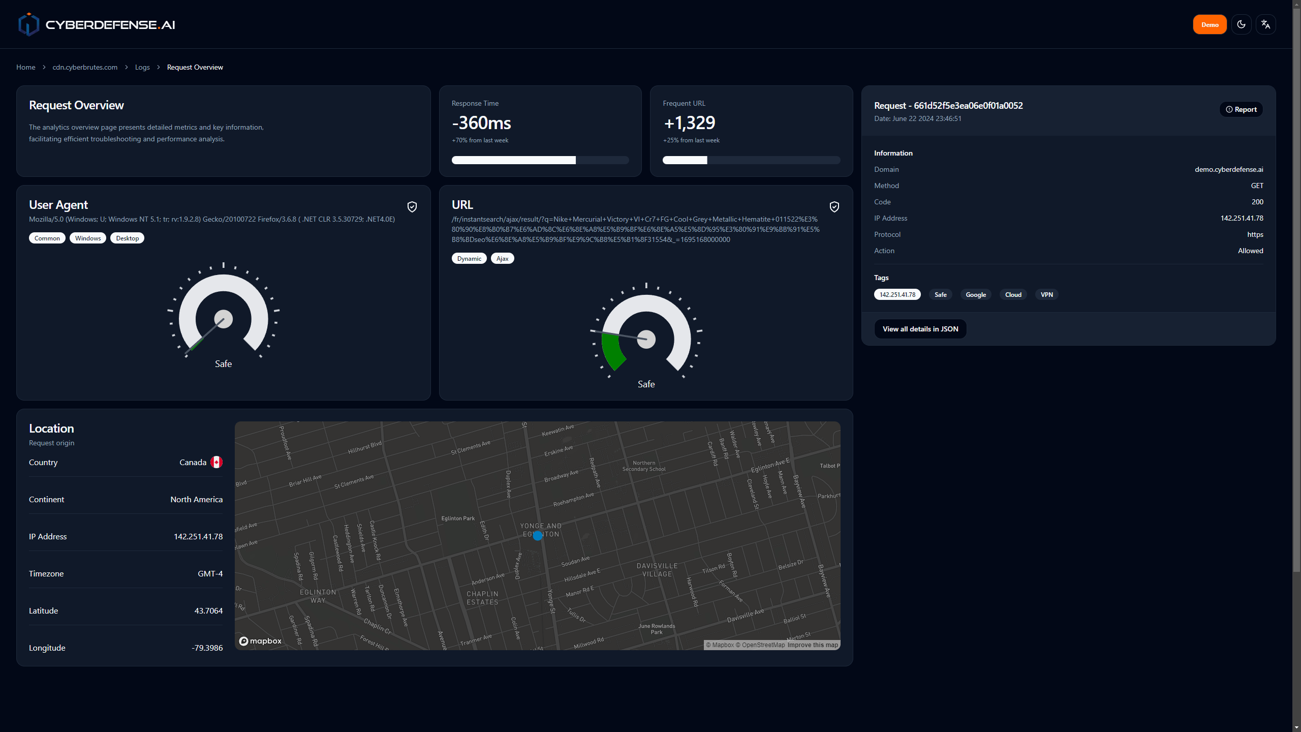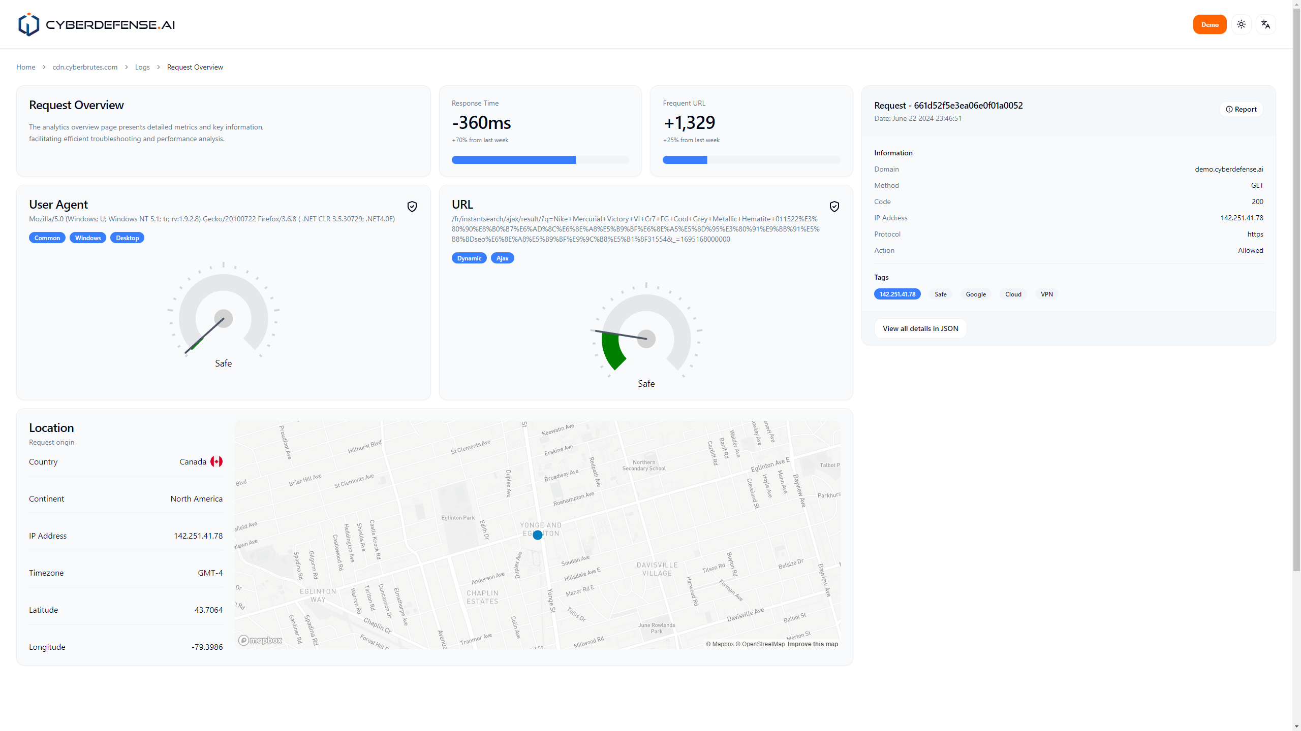 AI enables CYBERDEFENSE.AI to automate the response to threats, allowing for faster response times and reducing the risk of impact. Threat actors are automatically redirected to cached responses to minimize the unwanted load coming from attacks.